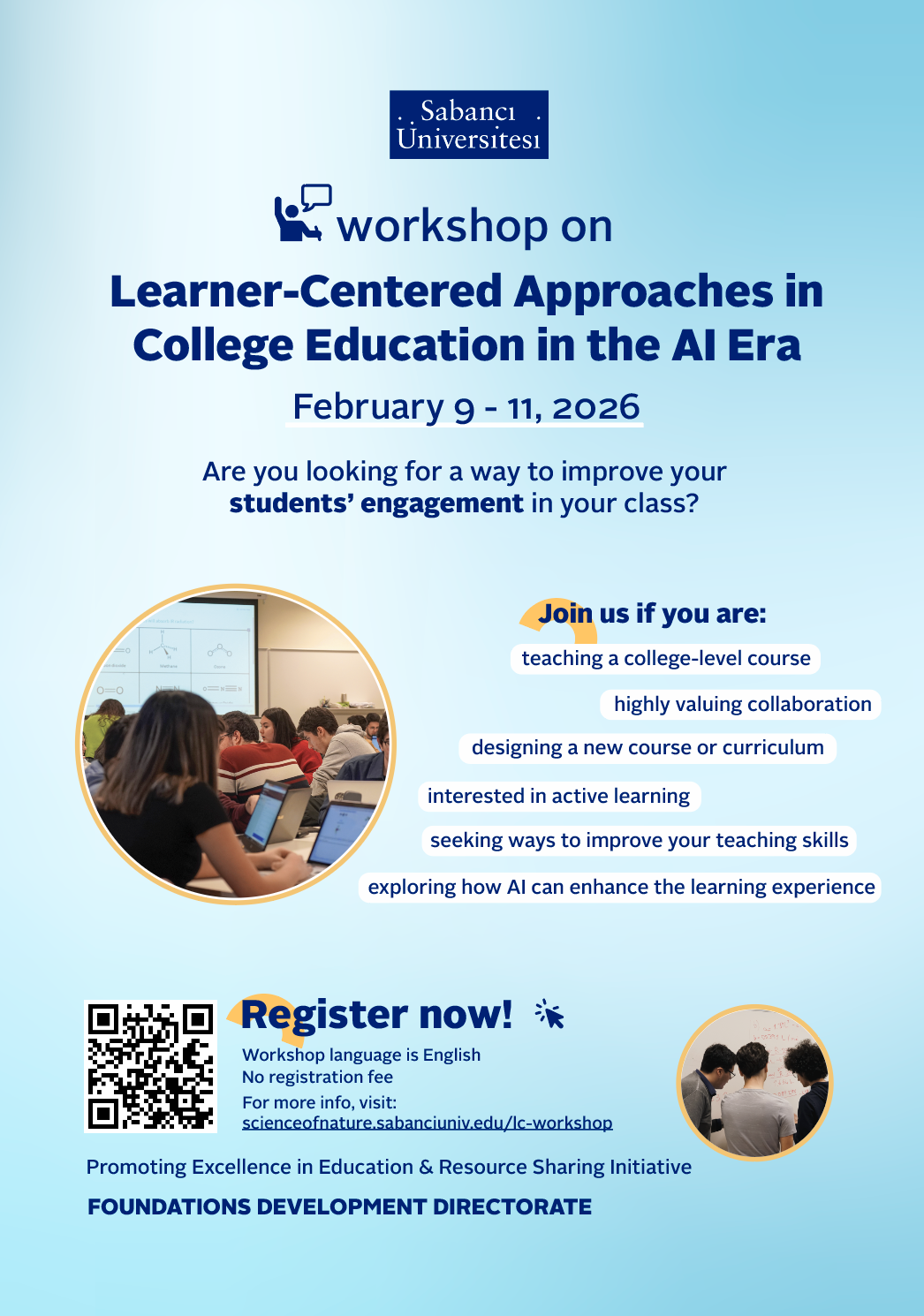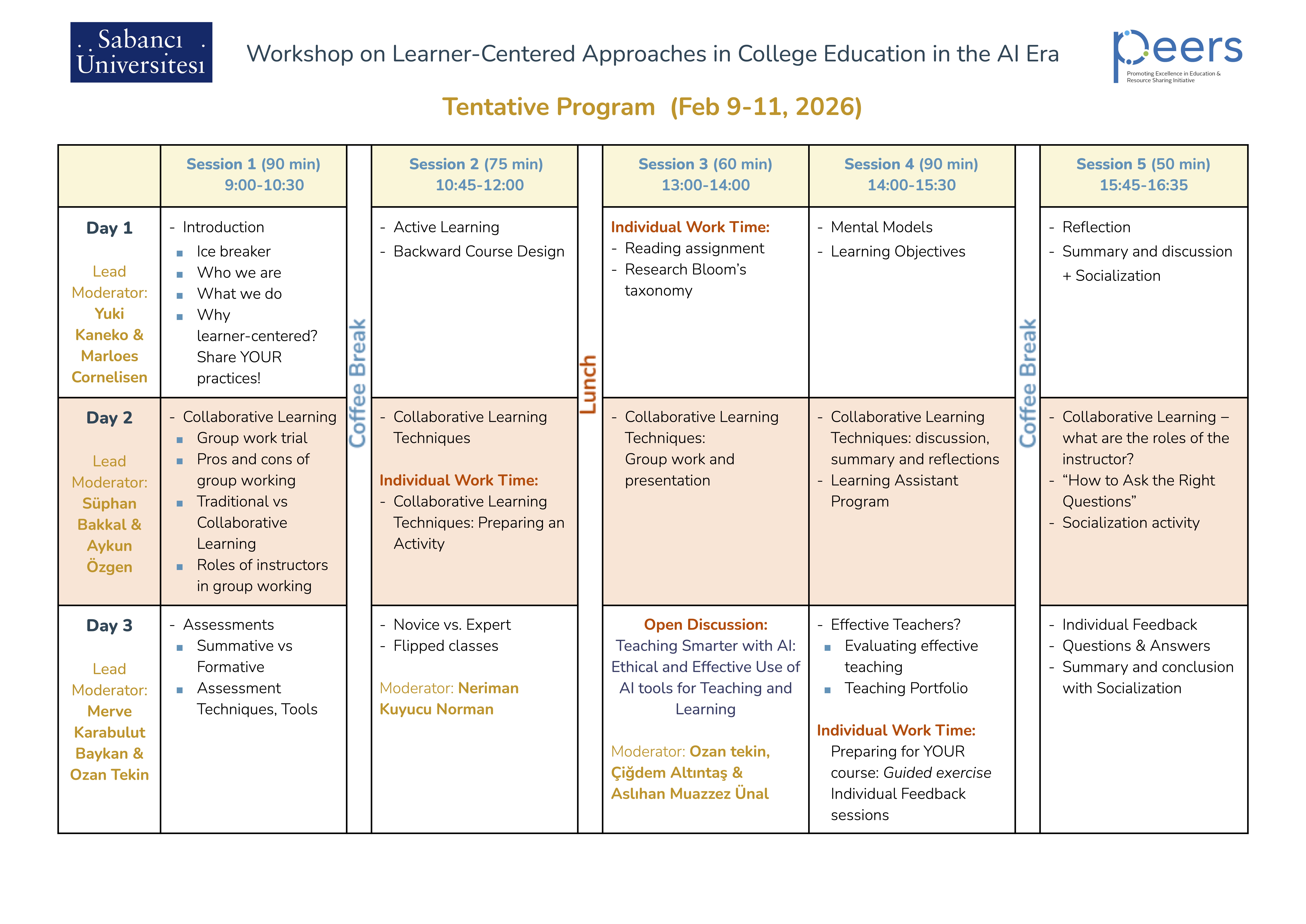 The Workshop on Learner-Centered Approaches in College Education in the AI Era is aimed at sharing teaching resources and experiences we have gained while developing various core corriculum courses. This will also provide a valuable professional development opportunity for college-level educators, who are interested in SoTL and in applying innovative approaches to their courses. Moreover, the workshop explores how digital learning tools including AI-supported technologies can be integrated into learner-centered teaching. We invite academics from Turkish universities in any discipline to join the workshop! The workshop is organized by the Promoting Excellence in Education and Resources Sharing (PEERS) Initiative*.