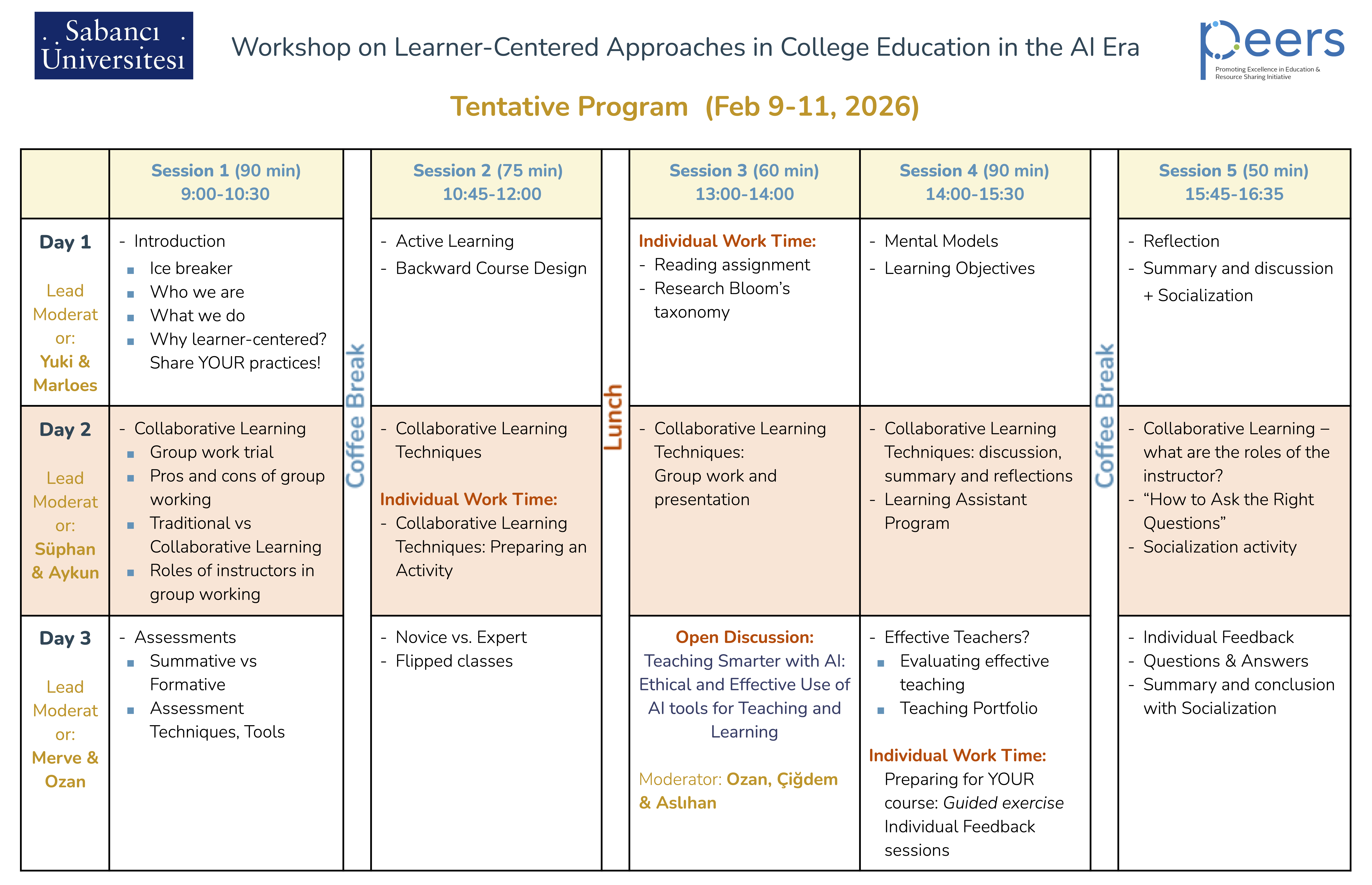 The Workshop on Learner-Centered Approaches in College Education in the AI Era is aimed at sharing our experiences and providing a professional development opportunity for college-level educators, who are interested in SoTL and in applying innovative approaches to their courses. We plan to compile and anonymously share the participants’ experiences and resources they find in the process on this website, which we hope will benefit the larger educator community within Türkiye and beyond.